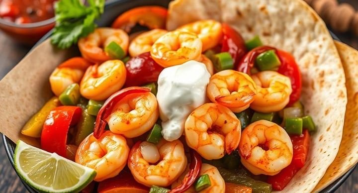 Juicy shrimp sautéed with bell peppers and onions, served sizzling with warm tortillas, guacamole, sour cream, and fresh salsa for a vibrant, flavorful dish