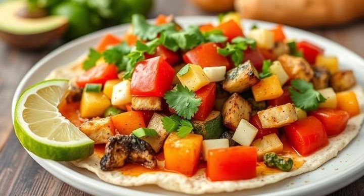 Sizzling bell peppers, onions, and a mix of seasoned vegetables, served with warm tortillas, guacamole, sour cream, and fresh salsa for a vibrant, flavorful meal