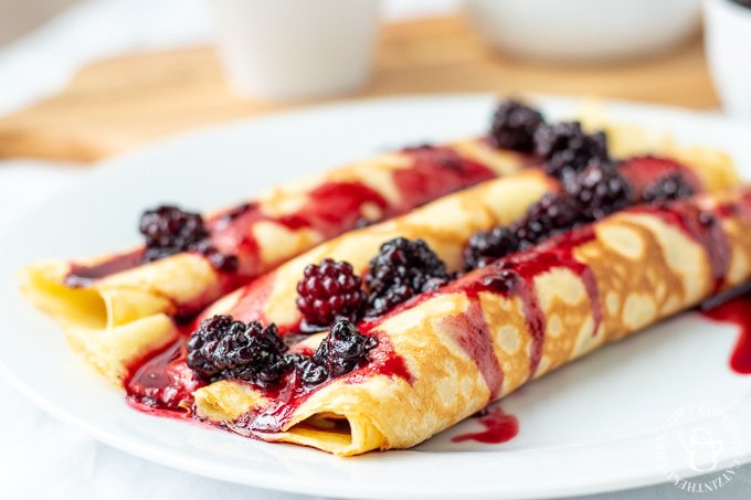 A soft crepe filled with fresh strawberries and whipped cream, topped with powdered sugar and a drizzle of chocolate sauce