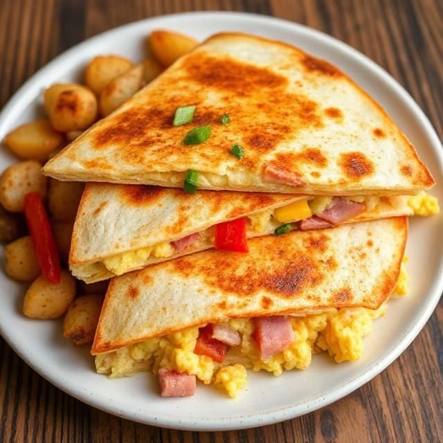 Scrambled Eggs, Ham. Green Onion, Red Pepper, Cheddar Cheese, Breakfast Potatoes