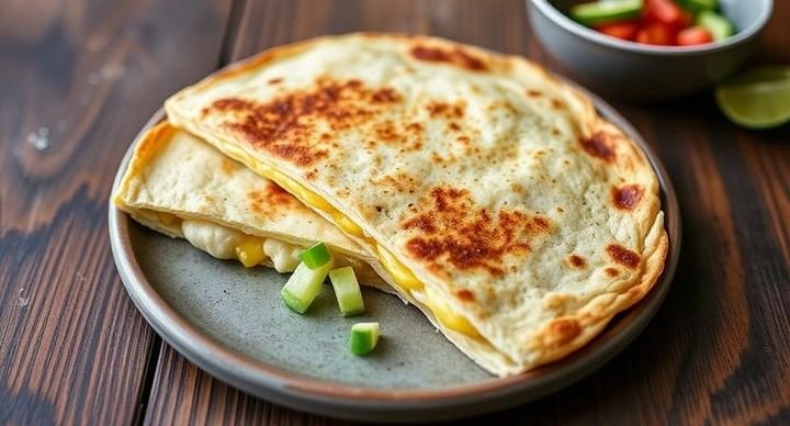 Melted cheese oozing between warm, toasted tortillas, served with a side of tangy salsa and sour cream for the ultimate cheesy comfort