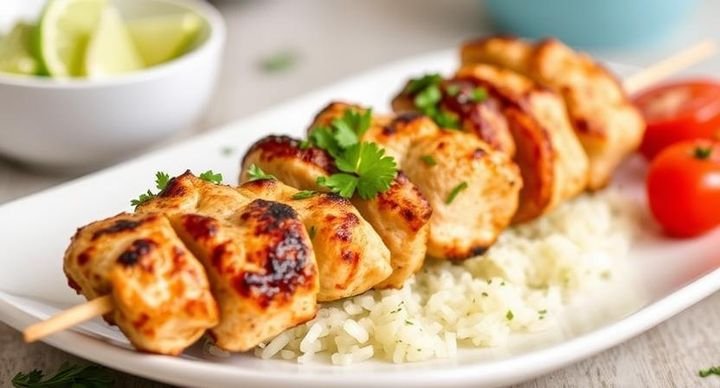 Juicy chicken marinated in Mediterranean spices, skewered and grilled to perfection, served with saffron rice, fresh vegetables, and a side of tangy tzatziki sauce