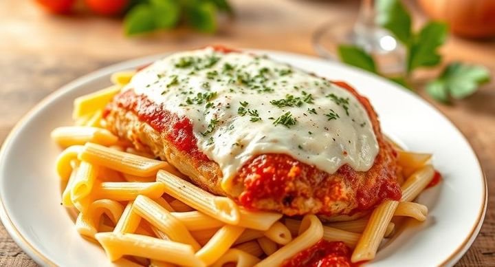 Crispy, breaded chicken cutlets topped with marinara sauce, melted mozzarella, and parmesan, baked to golden perfection and served with a side of pasta