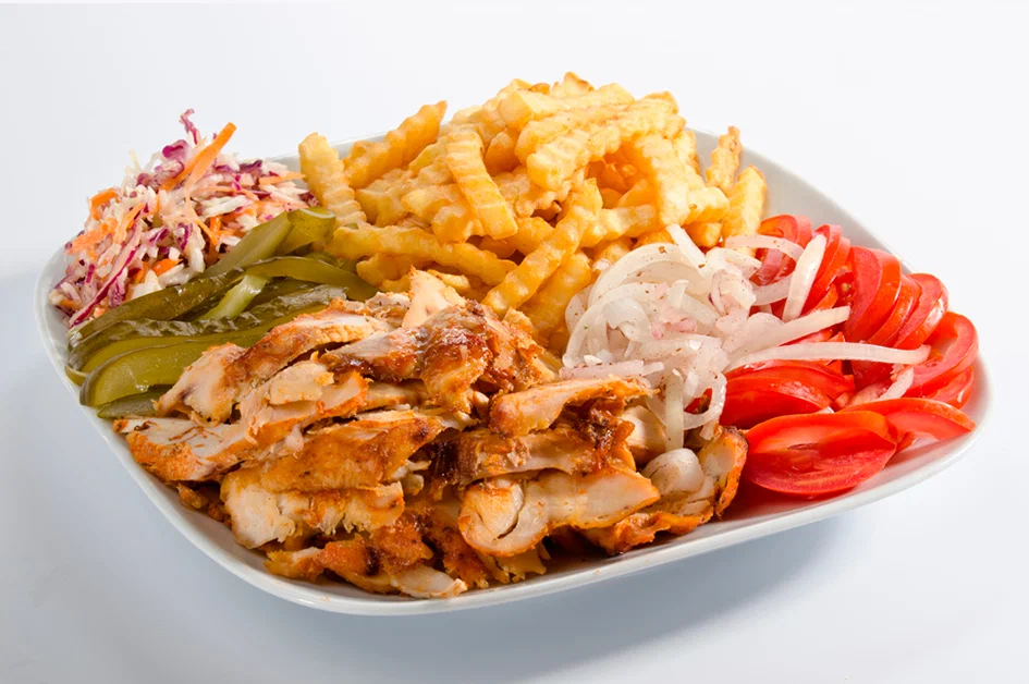 Thinly sliced, spiced grilled chicken served with rice, salad, warm pita, and garlic