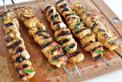 Chicken skewers with Middle Eastern flavor, paired with saffron rice, grilled vegetables, and a side of garlic dip