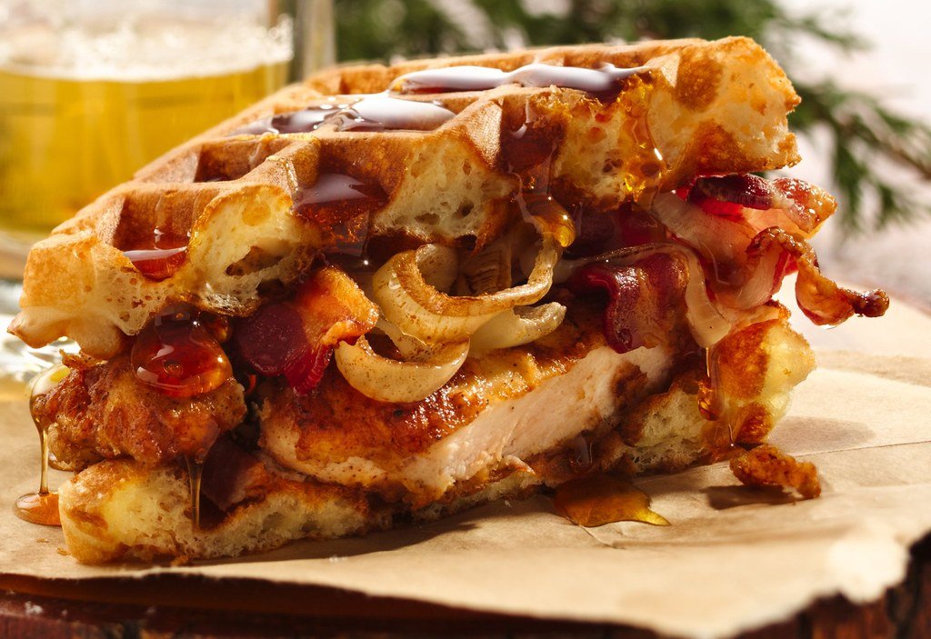 Fried chicken breast, candied peppered bacon, sliced jalapeño, hot honey