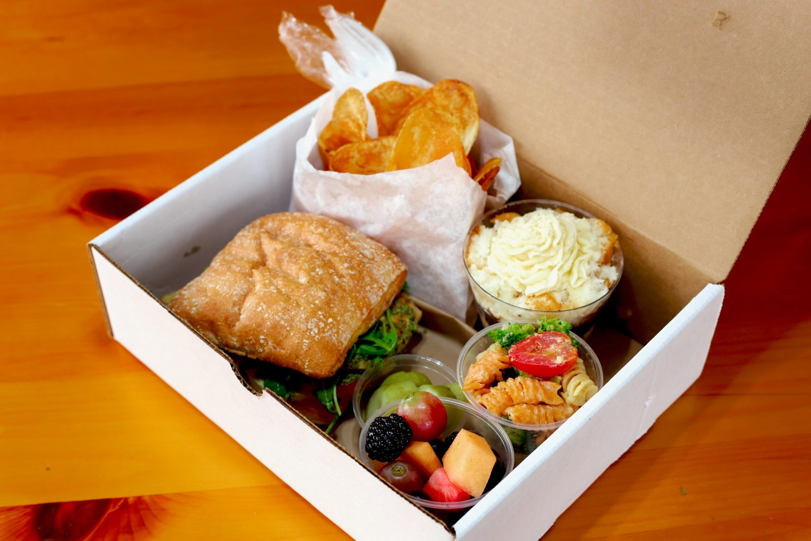Includes your choices of sandwiches and side, chips, a pickle, and a cookie. Add drinks, and you’re all set. Be sure to purchase plates & utensils if you’ll need them (from the Miscellaneous category).