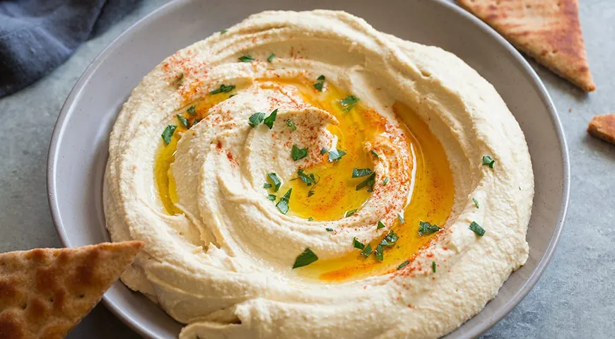 creamy hummus served with fresh pita, crunchy vegetables, olives
