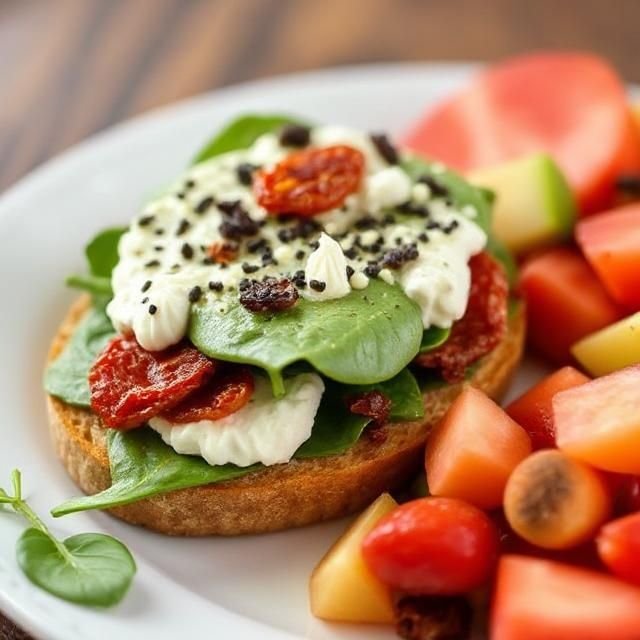 Vegetarian. spinach, cream cheese, asiago and sun-dried tomatoes a side of fresh fruits