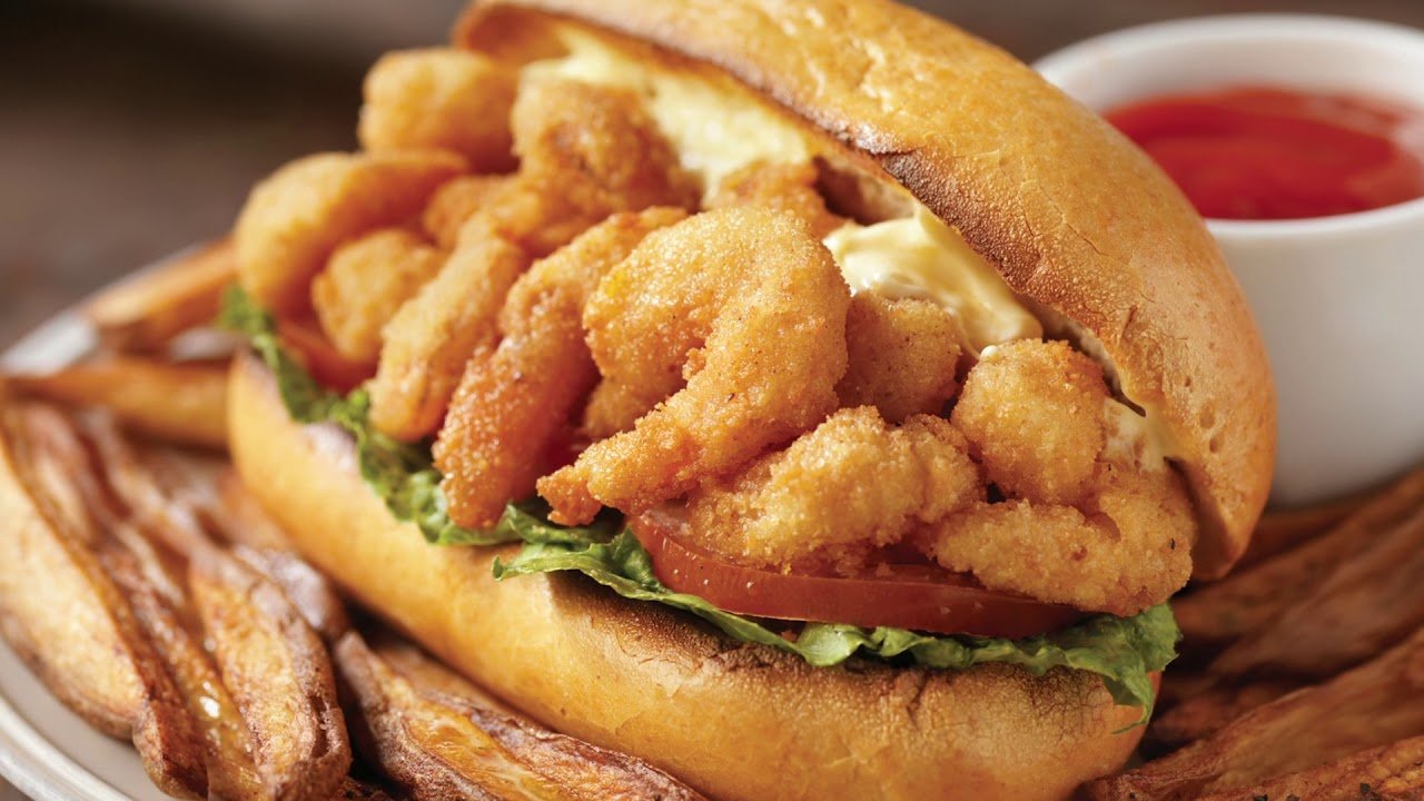 Crispy Cajun-seasoned shrimp piled on a toasted hoagie roll with lettuce, tomato,