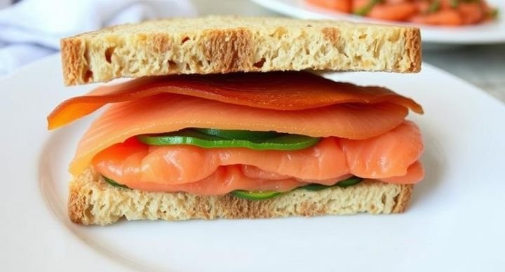 Delicately smoked Atlantic salmon, paired with crisp greens, creamy spread, and tangy capers, served on freshly baked bread