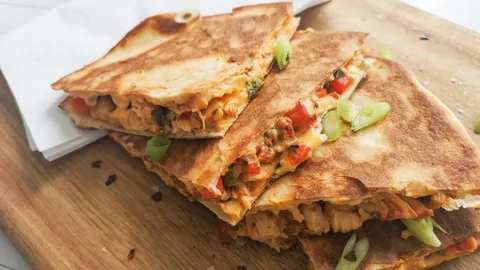 Crispy grilled tortilla stuffed with a blend of mozzarella, cheddar, feta, and queso
