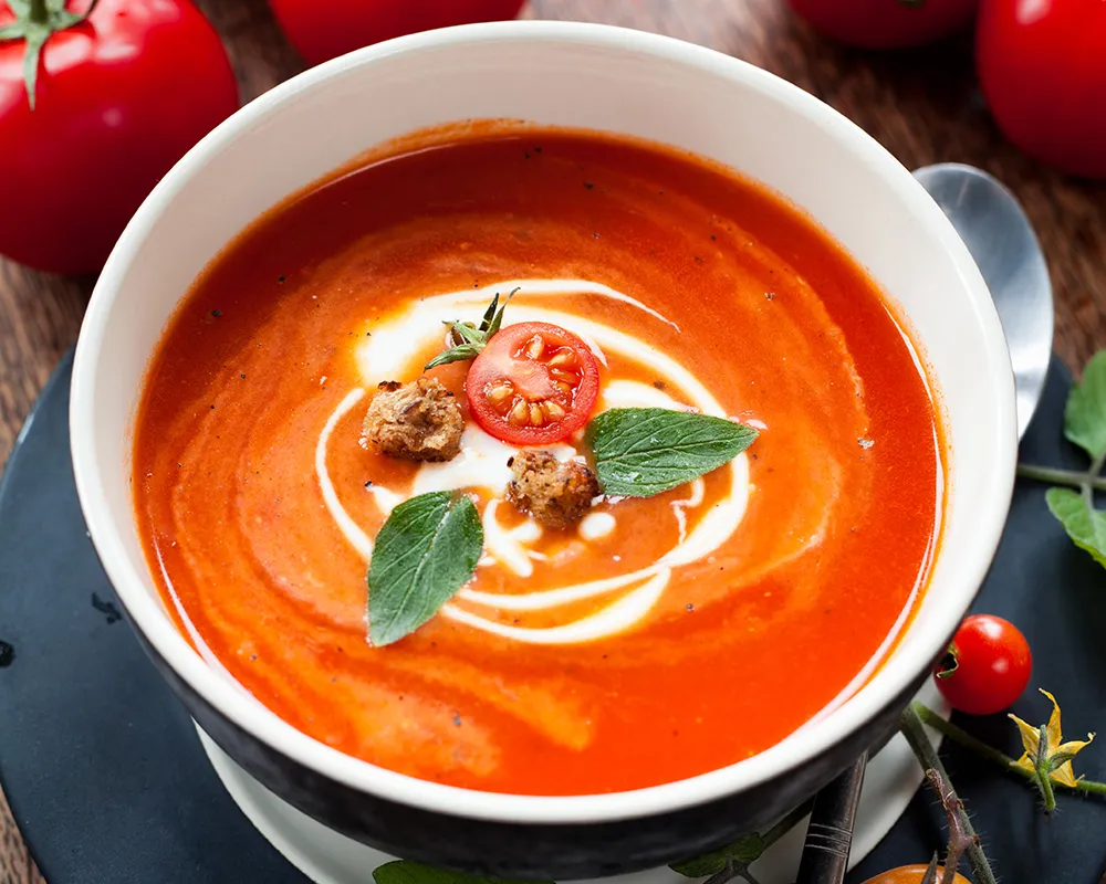 A silky tomato bisque brightened with fresh basil and finished with a basil oil drizzle and crisp crostini.