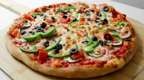 fresh bell peppers, onions, mushrooms, black olives, and tomatoes layered over tangy tomato sauce and melted mozzarella on a hand-tossed crust